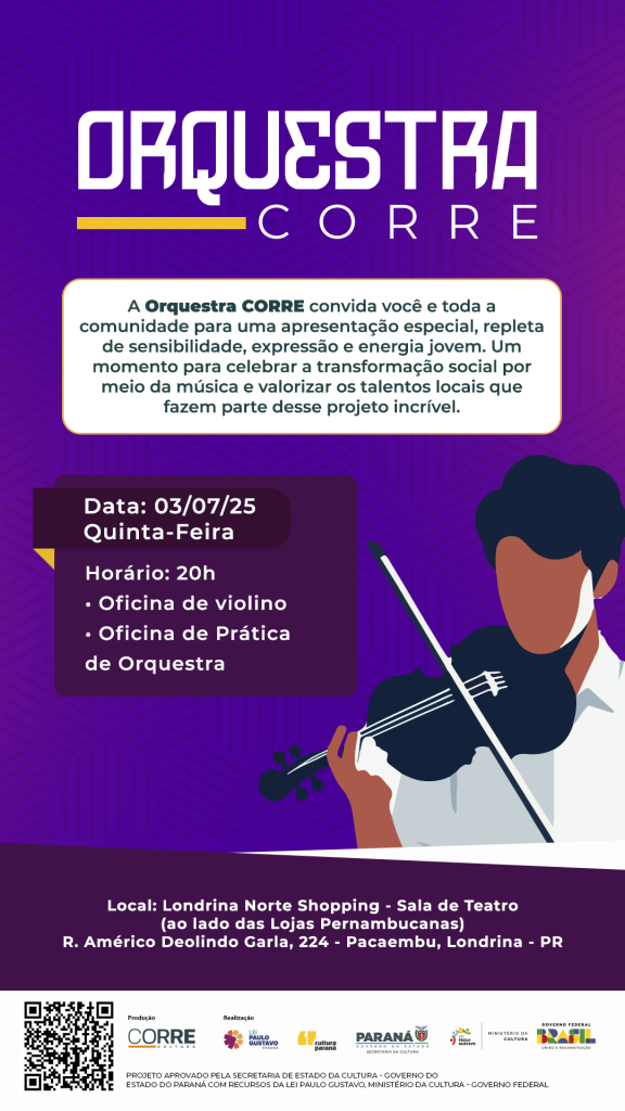 A Orquestra Corre é financiada por meio da Lei Paulo Gustavo, com apoio da Secretaria de Cultura do Governo do Estado do Paraná (Cultura Paraná) e do Ministério da Cultura – Governo Federal, juntamente ao Corre Cultura em Londrina, no Paraná.