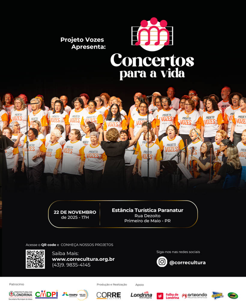 O projeto Concertos para a Vida chega a Primeiro de Maio levando a sensibilidade, o talento e a energia de um dos maiores corais de idosos da região norte do Paraná. Formado por 100 participantes com idades entre 60 e 94 anos, o coral reúne vozes que carregam histórias de vida, memórias afetivas e um profundo amor pela música — elementos que emocionam o público a cada apresentação.